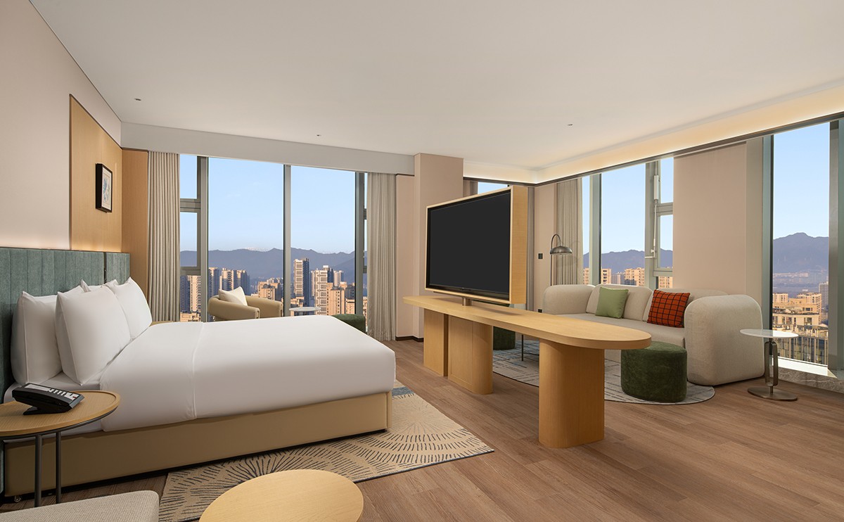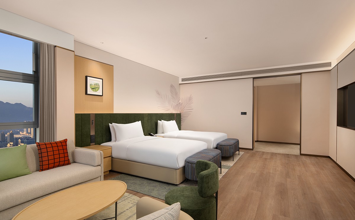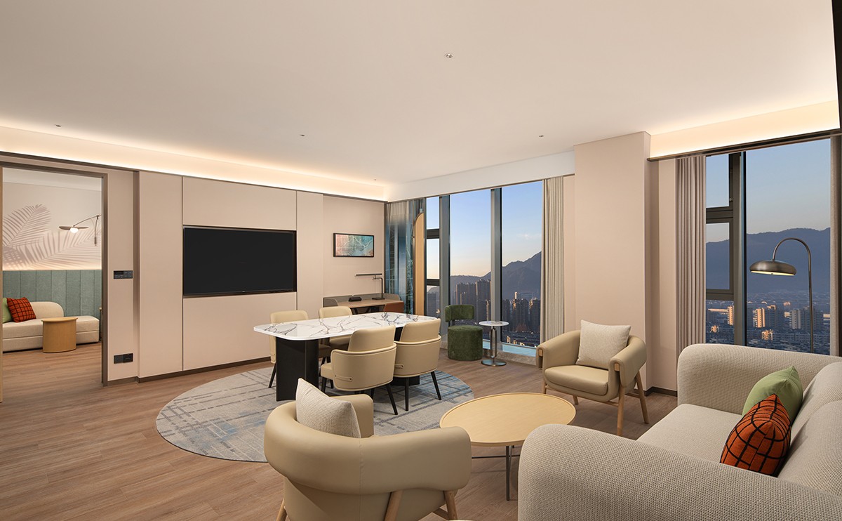 豪华空间90平方米,高清电视,免费WIFI,高楼层景观,智能化客房设施,内设独立客厅与卧室。