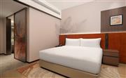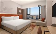 客房配备希尔顿花园标志性云端睡床与灵活办公区,升降式办公桌,迷你冰箱,65寸电视,落地窗,无线充电器,沙发