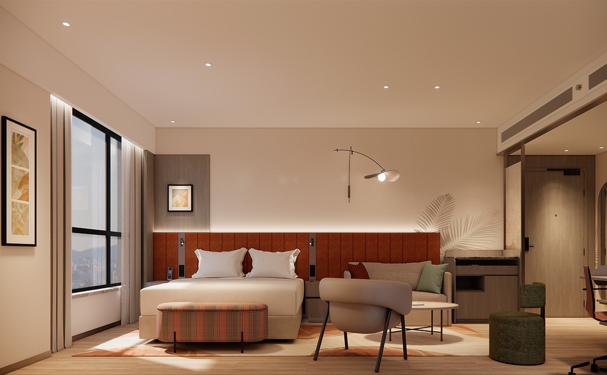独立浴缸,升降式办公桌,迷你冰箱,65寸电视,落地窗,无线充电器,可折叠式沙发床,浴缸