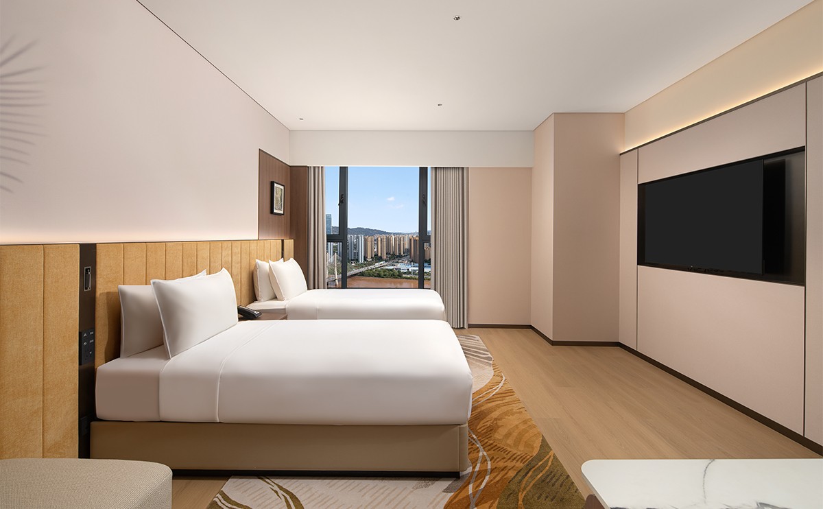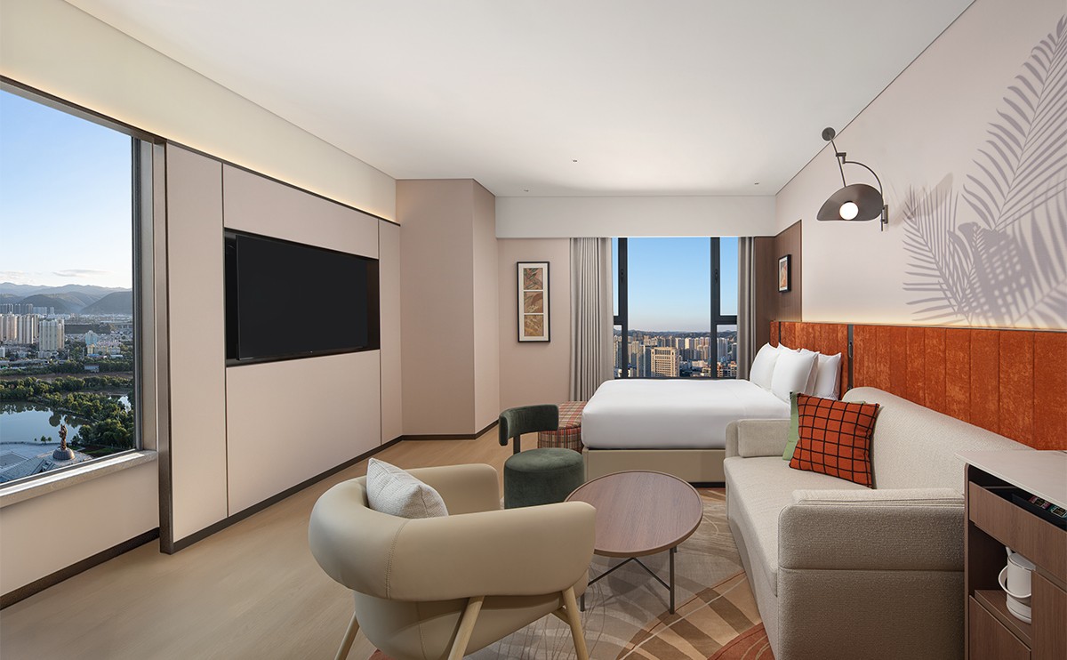 黄河景观,升降式办公桌,迷你冰箱,65寸电视,落地窗,无线充电器,沙发